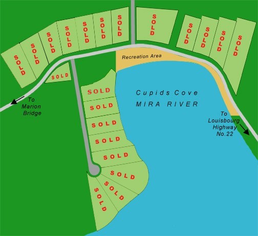 Come home to nature in Cape Breton. Imagine living in pristine beauty by the banks of the Mira River- just footsteps away from pictureque Cupids Cove. This sheltered and tranquil water inlet is located at Hillside, Cape Breton, Nova Scotia - a convenient 15 minutes from Sydney on Highway 22, and 2 kilometres from Albert Bridge. Click or tap on buttons to view plans: You can enjoy 'city living' amenities like fibre to the home internet and TV services and cellphone coverage, and have fishing, boating and hiking at your doorstep. All building lots have deeded water access to the Mira River. Our newly constructed recreation area at the base of Cupids Cove features 1300 feet of beautiful beach, and is ideal for launching boats, picnicking and swimming. The still waters of the cove provide an ideal spot for mooring boats and watercraft. Over the years, the Mira River has arguably been Cape Breton's most popular- and famous- vacation destination. With schools, hospitals, churches and shopping in easy driving distance, Cupids Cove is a great place to call home all year round. |